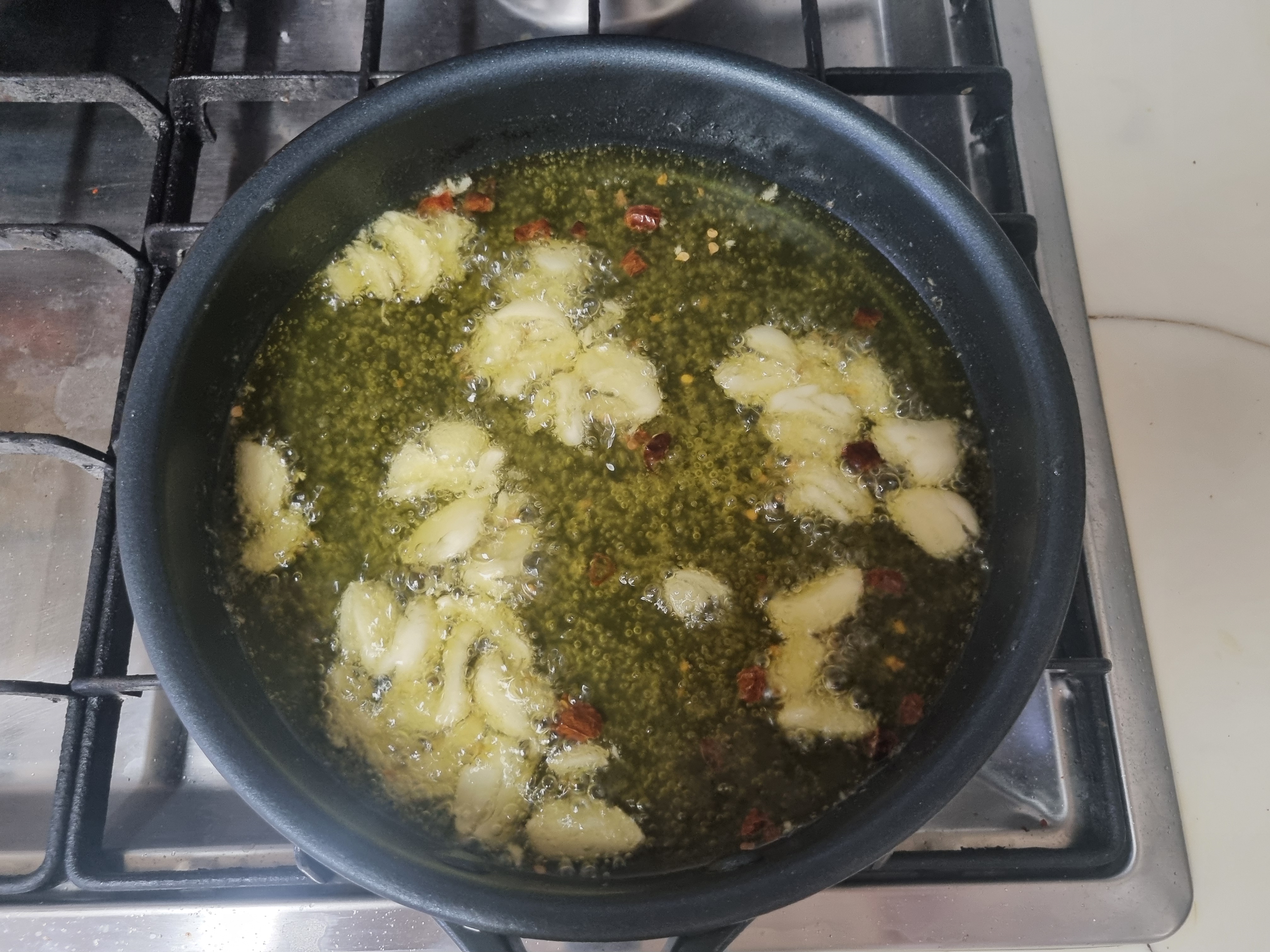 약불을 올린 뒤, 넓은 팬에다 으깬 마늘과 올리브유 170g, 페페로치노, 맛소금 1작은술을 부어줍니다.