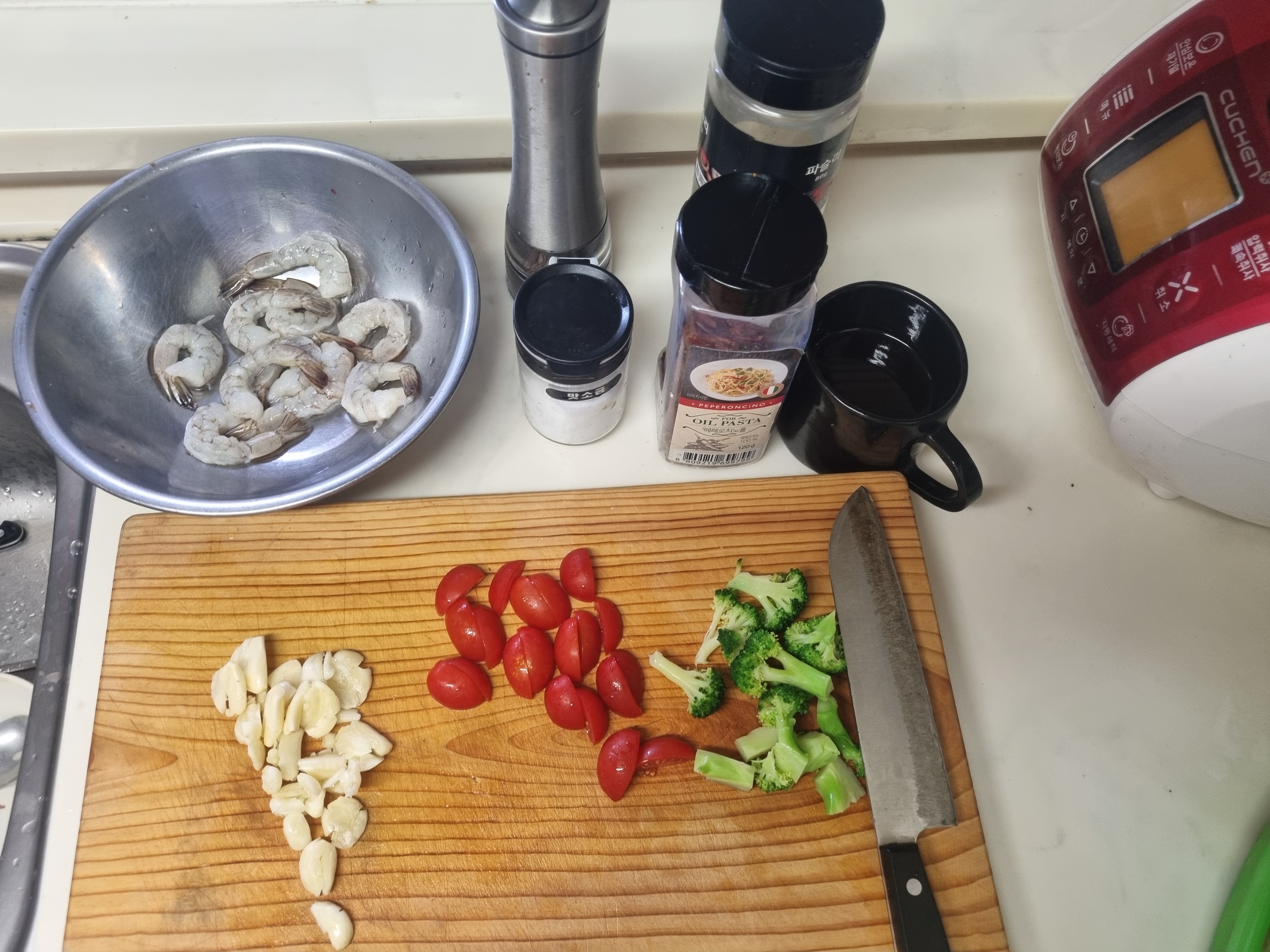 재료 : 냉동 생새우(혹은 자숙새우) 10마리, 통마늘 15알, 방울토마토 5알(선택), 브로콜리 적당량(선택), 페페로치노 5알, 올리브유 170g, 맛소금, 후추, 파슬리(선택)