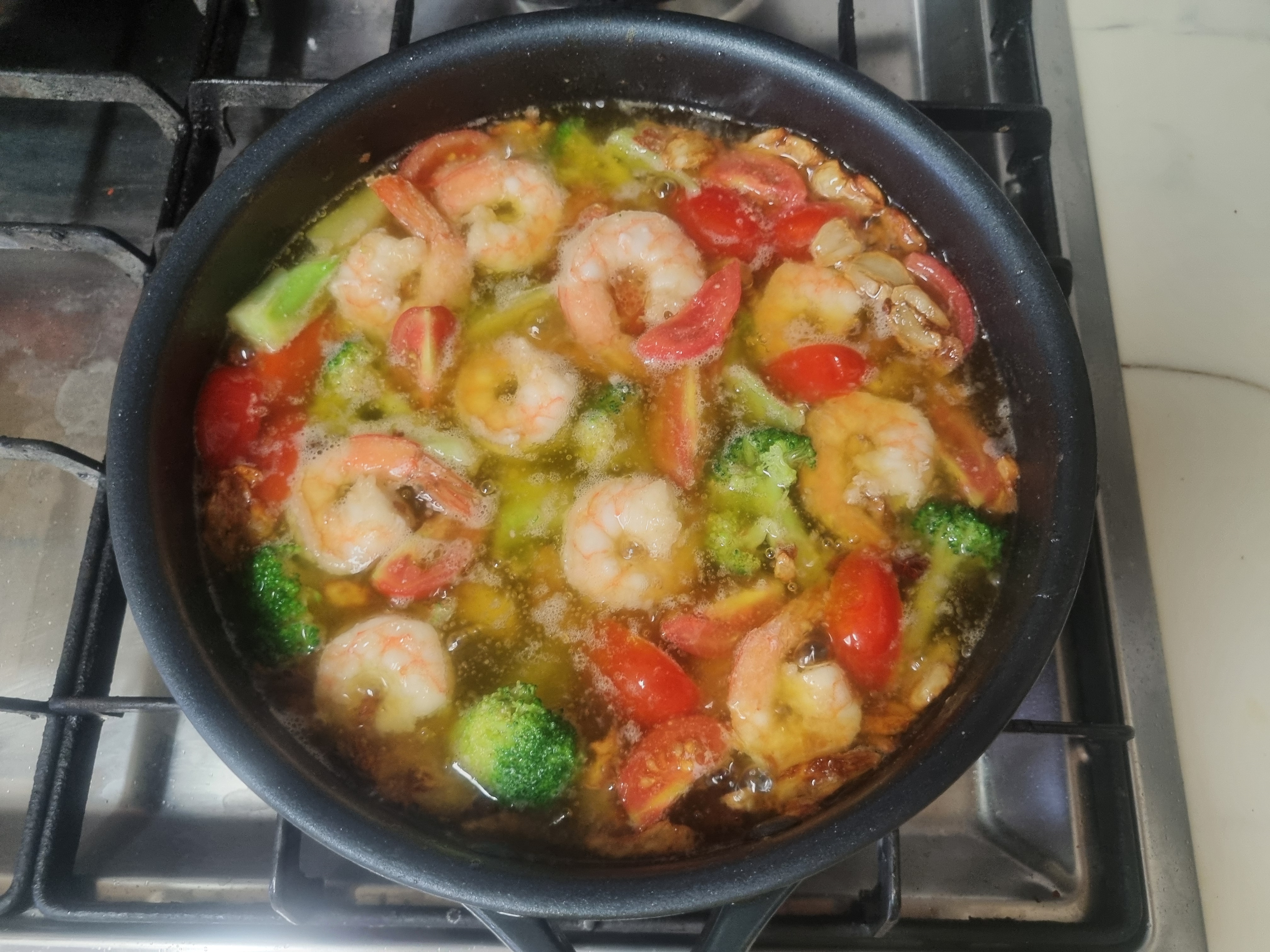 새우, 토마토, 브로콜리를 모두 넣어 익혀줍니다.