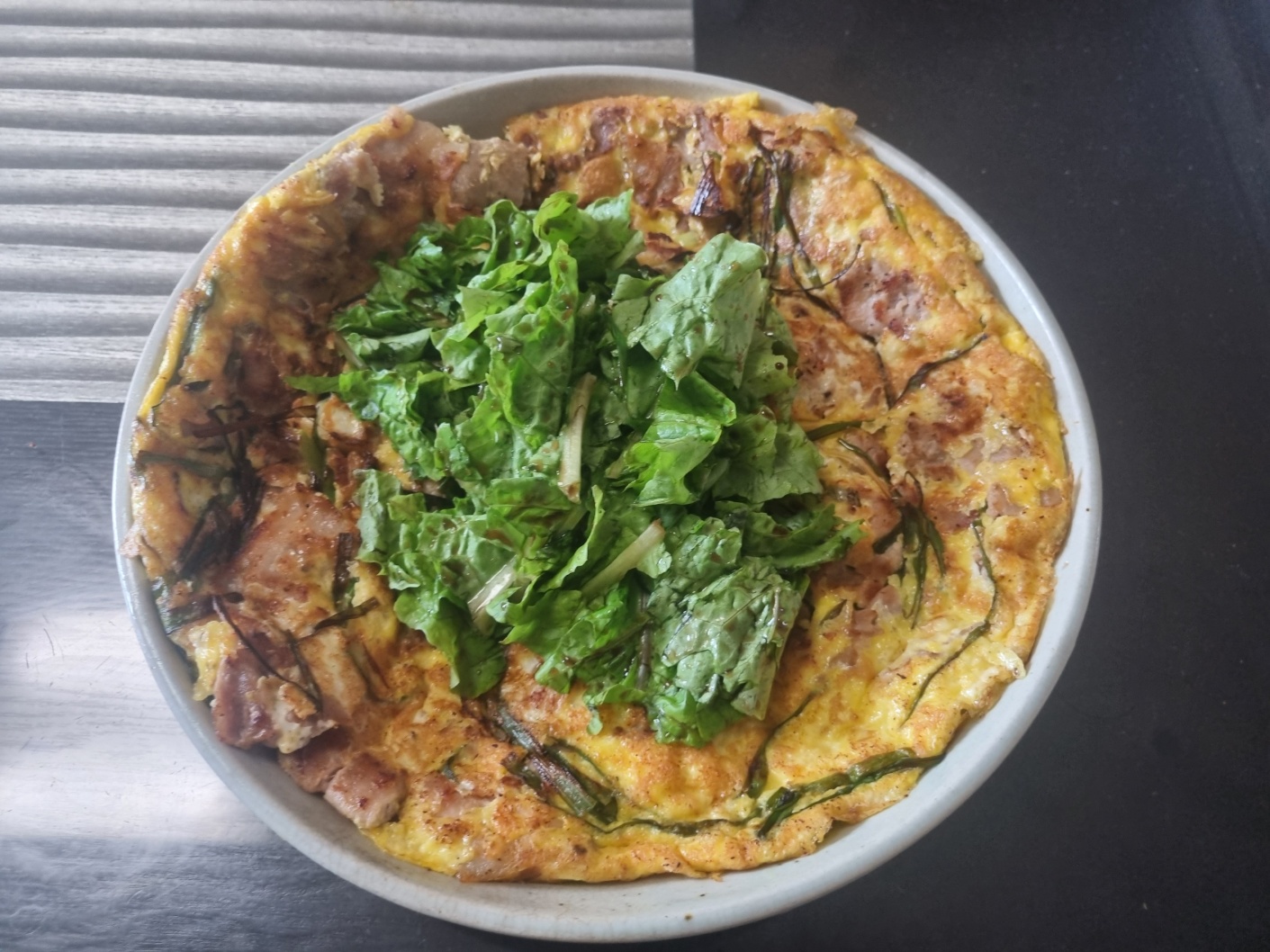 우선, 대패삼겹살 120g을 잘 해동해주시고, 그 사이에 대파의 초록색 부분의 동그랗게 말린 부분을 잘라 넓게 펼친 후 길고 얇게 썰어줍니다. 그리고 보울형 그릇에 계란 4개를 모두 풀어 소금과 후추 간을 가볍게 해줍니다. 대패삼겹살이 해동이 되면 팬에 잘 펼쳐서 구워줍니다. 팬 바닥이 가득찰 때까지 고기를 펼치면 여기에도 소금과 후추 간을 해줍니다. 그러다 대패삼겹살의 양면에 붉은 부분이 없이 잘 익으면 길게 썰어놓은 대파의 초록색 부분을 넣고 살짝 열을 가해 볶아줍니다. 20초 정도 볶고나면 미리 준비해놓은 계란물을 위에 부어줍니다. 이 때는 계란물을 한꺼번에 많이 붓는 것보다는 조금씩 고기와 고기 사이에 계란물을 채워준다고 생각하고 조금씩만 부어줍니다. 그렇게 바닥의 빈틈이 다 채워지고 나면 중약불로 줄여 계란이 서서히 익도록 둡니다. 밑의 계란 부분이 익었는지는 가장자리를 뒤집개로 살짝 들어내서 확인해보면 되는데, 만약 노릇노릇하게 밑부분이 익었다면 뒤집개로 가장자리부터 살살 떼내면서 육전을 뒤집어줍니다. 그러면 위에 있던 덜 익은 계란물이 밑으로 가면서 서서히 익기 시작하는데, 그 사이에 계란을 풀었던 보울형 그릇을 잠시 씻고 여기에 씻은 상추 10장을 한입크기로 찢어줍니다. 그러고나서 레몬주스 1큰술과 발사믹 글레이즈 1큰술을 섞어 간단하게 상추 샐러드를 만들어줍니다. 팬에 있는 한 쪽 계란마저 익으면, 이를 접시에 담아준 후, 상큼한 상추 샐러드까지 위에 올려주면 완성입니다.