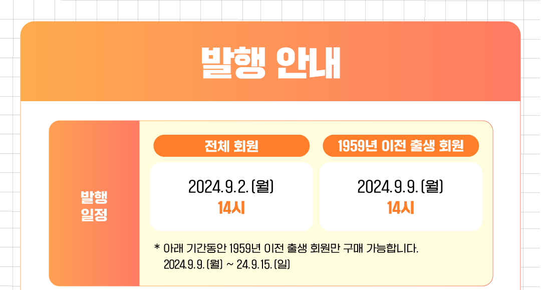 2024년 9월 2일 14시부터 8일까지는 전체 회원, 9일 14시부터 15일까지는 1959년 이전 출생 회원 대상으로 발행합니다.